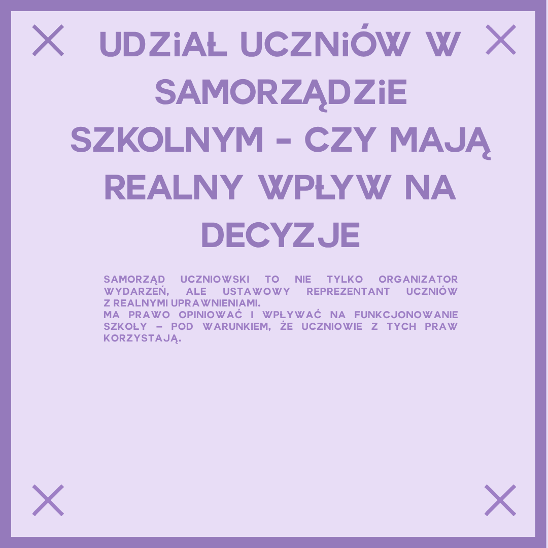 Wobec tego samorząd uczniowski nie jest wyłącznie organizatorem wydarzeń szkolnych, lecz jest ustawowym reprezentantem uczniów. Prawo przyznaje SU szerokie prawa opiniowania, składania wniosków oraz kształtowania życia szkolnego. Dość często uprawnienia te jednak nie zostają wykorzystane z powodu braku świadomości ich istnienia. Realny wpływ samorządu zaczyna się od wiedzy o przysługujących mu kompetencjach. Samorząd uczniowski ma wiele praw, trzeba je tylko znać i odważyć się z nich korzystać.